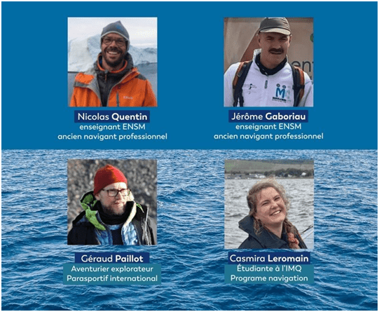 L’équipe est composée de sept personnes, dont cinq issues de l’IMQ et de l’ENSM (France), incluant les deux enseignants initiateurs du projet de transatlantique. Géraud avec qui ils partagent les valeurs associatives à travers son handicap et une personne pour filmer cette aventure au long cours.